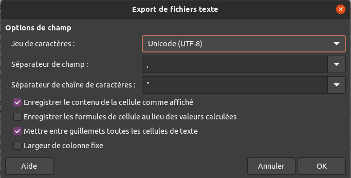 - Enregistrer le fichier au format ".csv" en spécifiant les guillemets """ comme séparateurs de textes, les virgules "," comme séparateurs de champs et en veillant à bien activer la mise entre guillemets des cellules de textes.