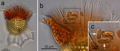 L'image ci-dessous présente des cyano-bactéries (encadrés) à côté d'un dynoflagelé (une algue).
